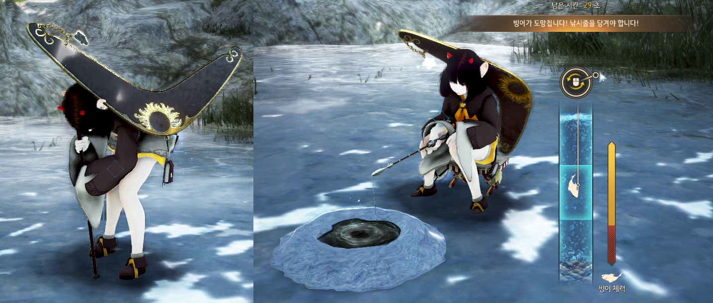 *빙어를 지치게 하려면 위의 방법을 이용하여 빙어가 게이지의 짙은 하늘색 부분 (중앙)에 머물게 해야 합니다.