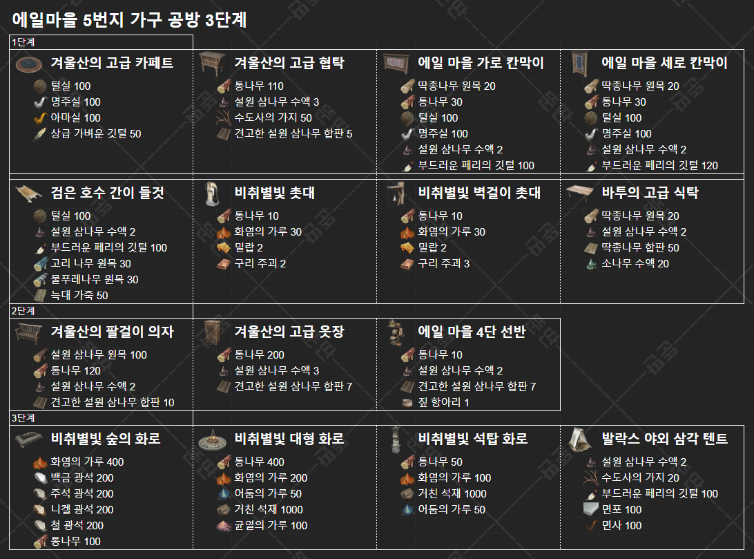 겨울산의 고급 카페트 / 겨울산의 고급 협탁 / 에일 마을 가로 칸막이 / 에일 마을 세로 칸막이 / 검은 호수 간이 들것 / 비취별빛 촛대 / 비취별빛 벽걸이 촛대 / 바투의 고급 식탁 / 겨울산의 팔걸이 의자 / 겨울산의 고급 옷장 / 에일 마을 4단 선반 / 비취별빛 숲의 화로 / 비취별빛 대형 화로 / 비취별빛 석탑 화로 / 발락스 야외 삼각 텐트
