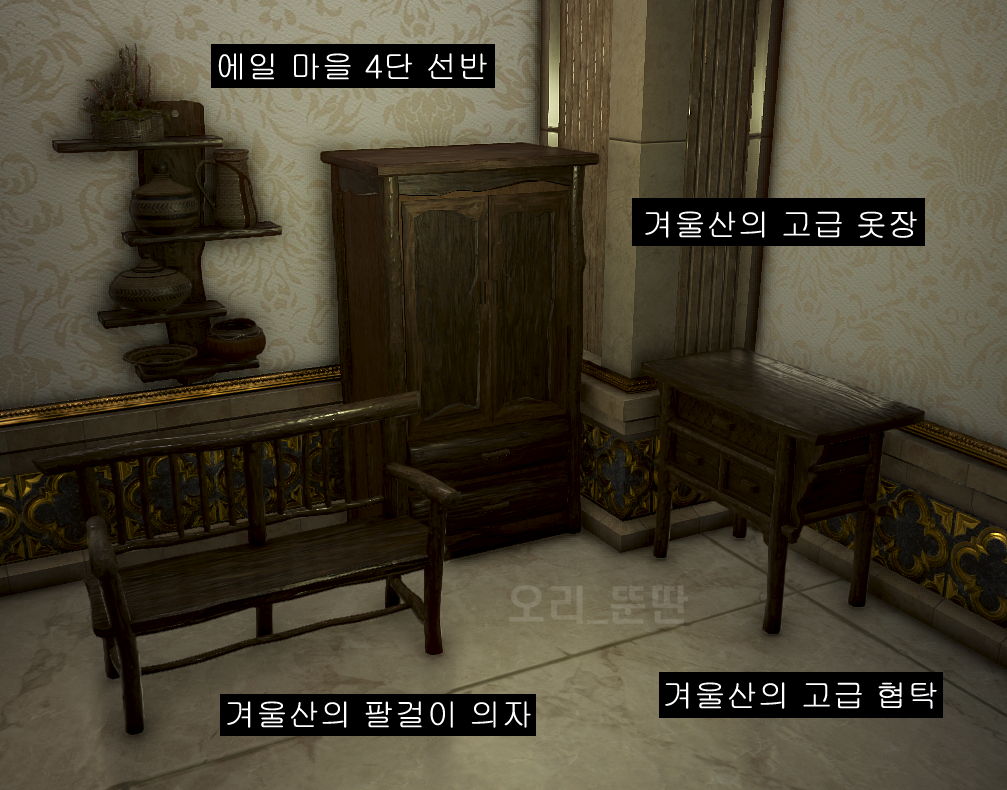 겨울산의 고급 카페트 / 겨울산의 고급 협탁 / 에일 마을 가로 칸막이 / 에일 마을 세로 칸막이 / 검은 호수 간이 들것 / 비취별빛 촛대 / 비취별빛 벽걸이 촛대 / 바투의 고급 식탁 / 겨울산의 팔걸이 의자 / 겨울산의 고급 옷장 / 에일 마을 4단 선반 / 비취별빛 숲의 화로 / 비취별빛 대형 화로 / 비취별빛 석탑 화로 / 발락스 야외 삼각 텐트